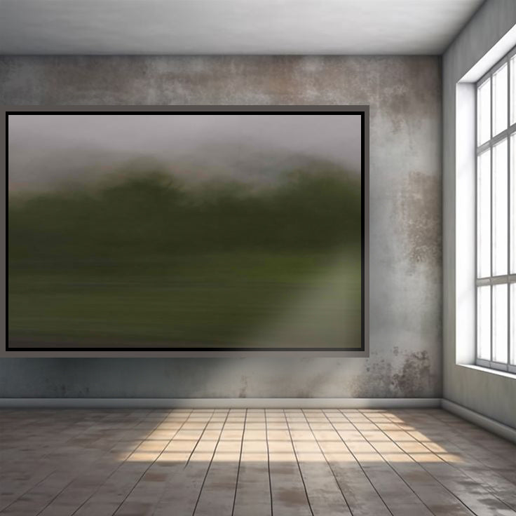 Et øyeblikk fanget i fart. Bildet glir mellom grønt landskap og grå himmel, som om naturen strekkes ut i bevegelse. Det diffuse uttrykket skaper et mystisk, nesten drømmende preg – som om du ser verden idet den forsvinner forbi tog vinduet. Et øyeblikk som både er flyktig og hypnotiserende.